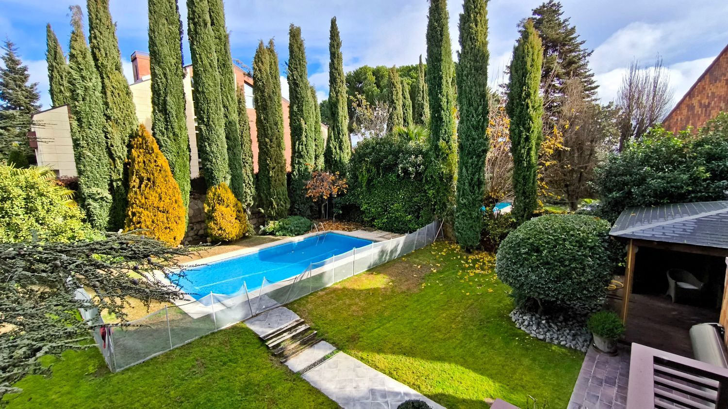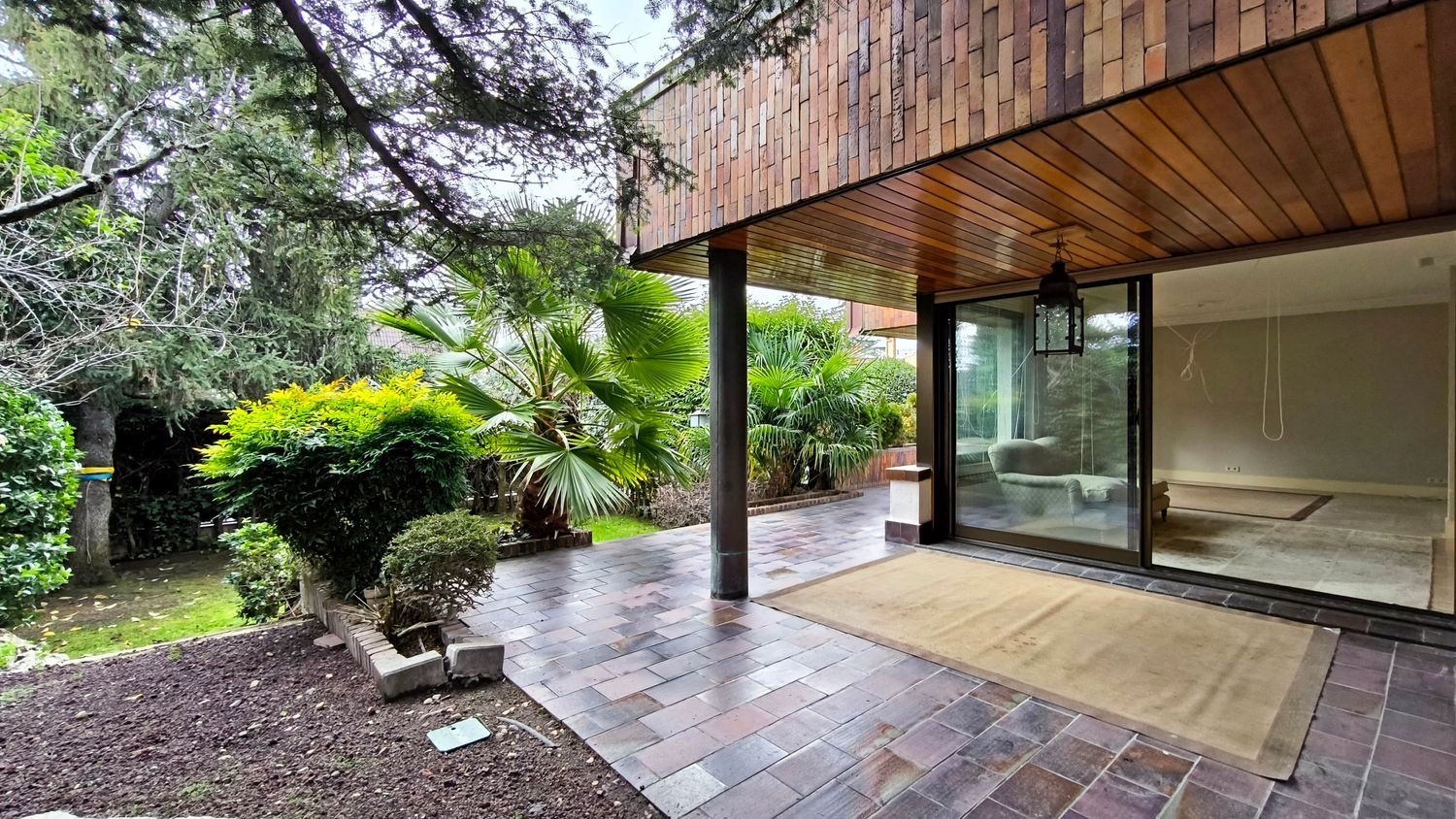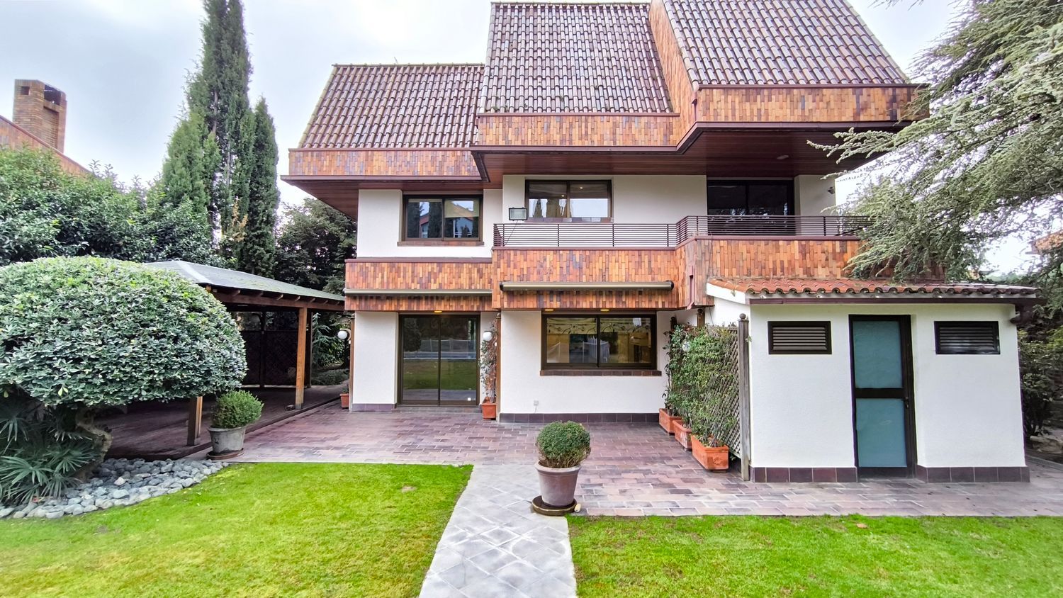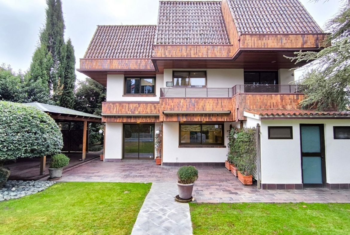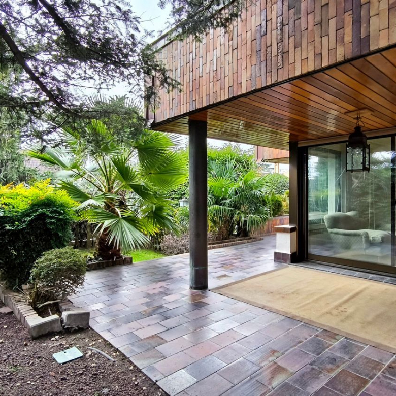 El exterior de la casa es igualmente impresionante. El jardín, perfectamente cuidado, incluye una piscina y varias áreas de descanso, ofrece un espacio de meditación y tranquilidad.