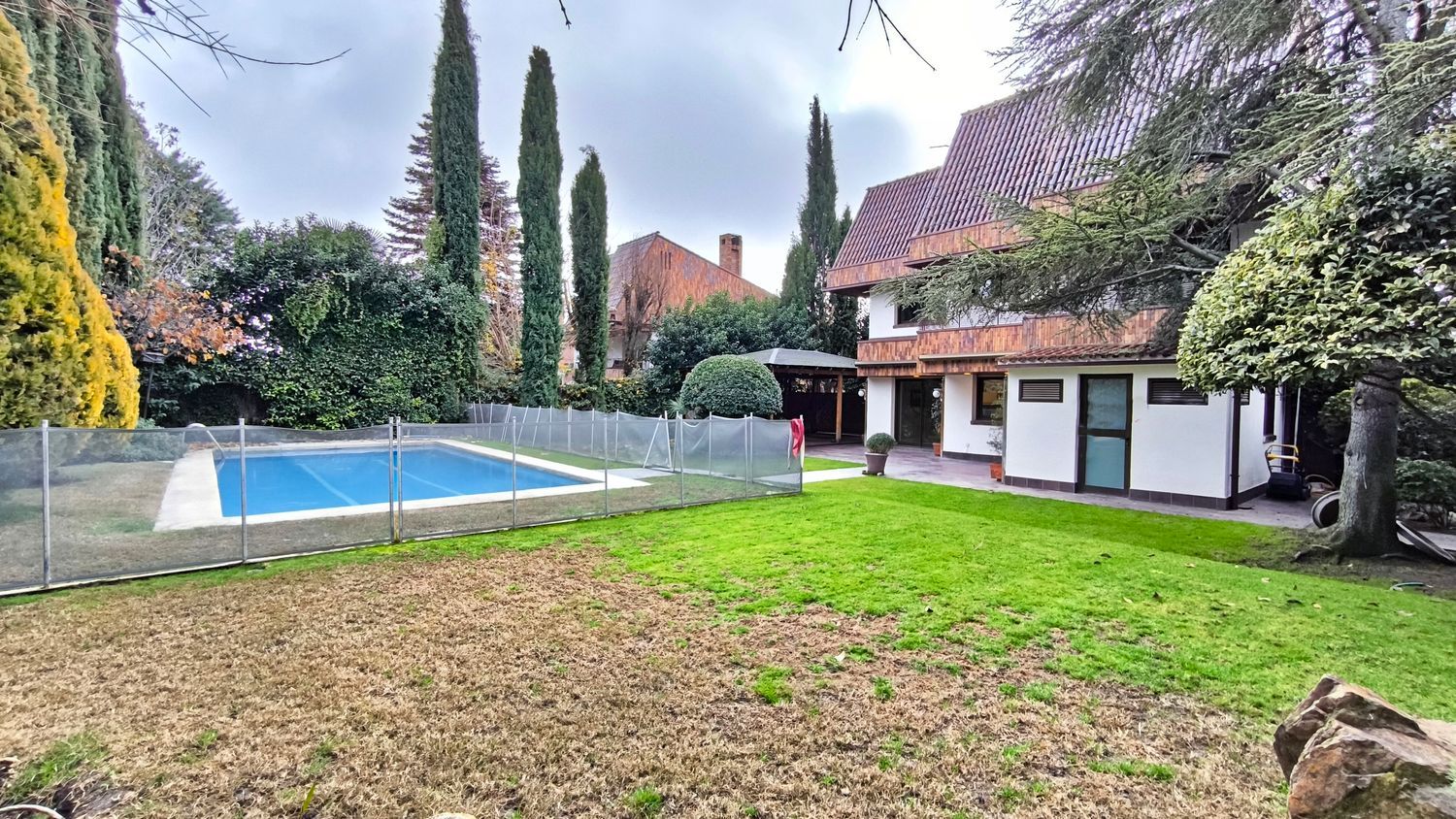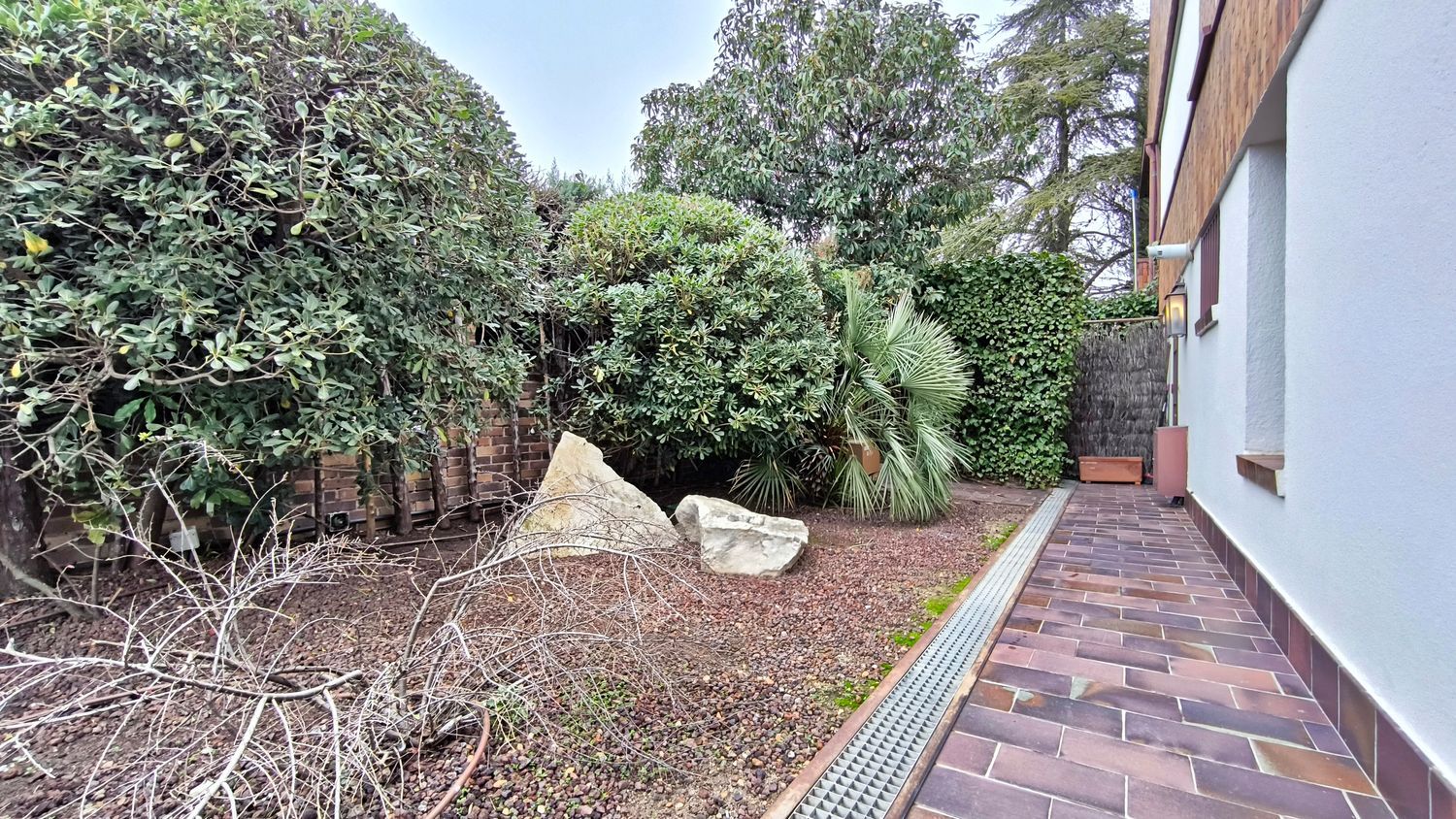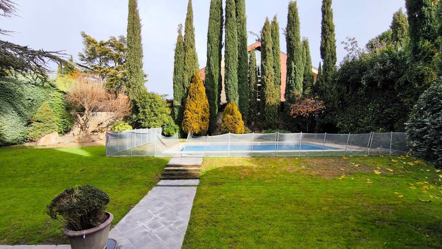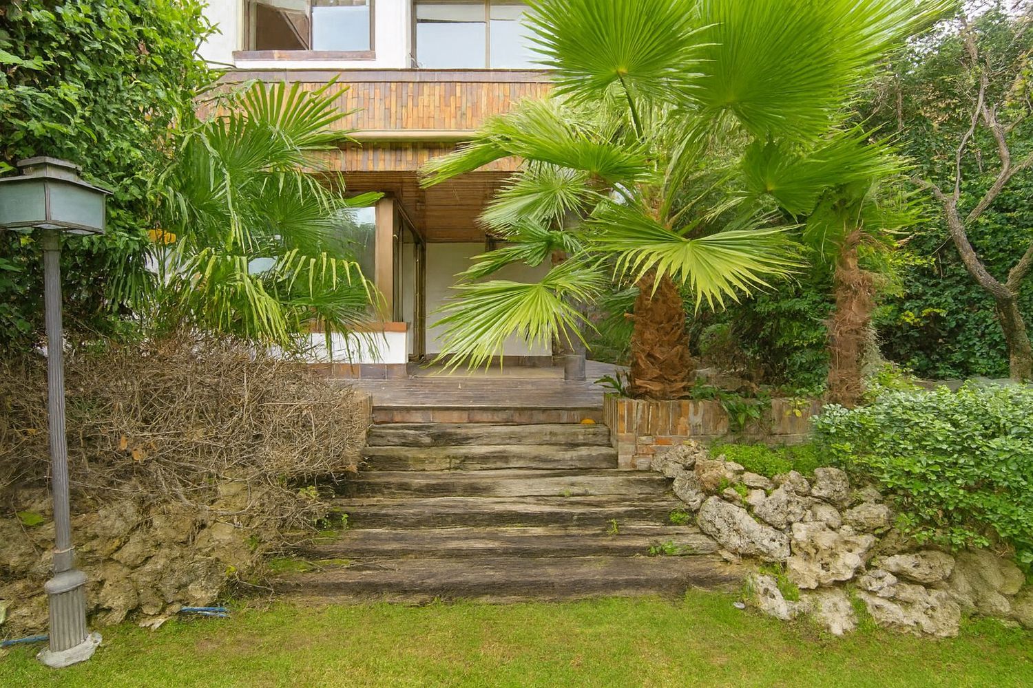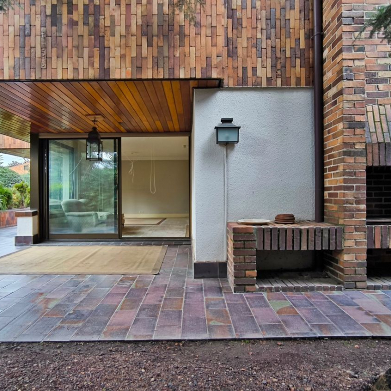 El exterior de la casa es igualmente impresionante. El jardín, perfectamente cuidado, incluye una piscina y varias áreas de descanso, ofrece un espacio de meditación y tranquilidad.