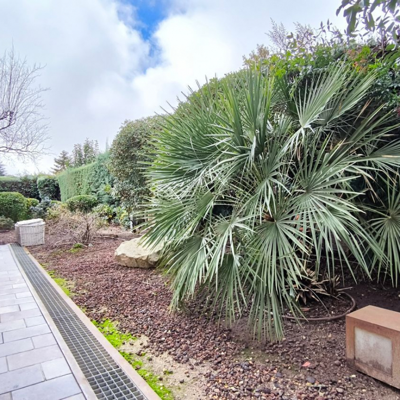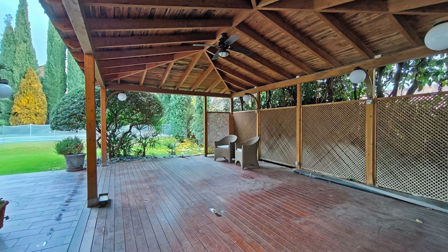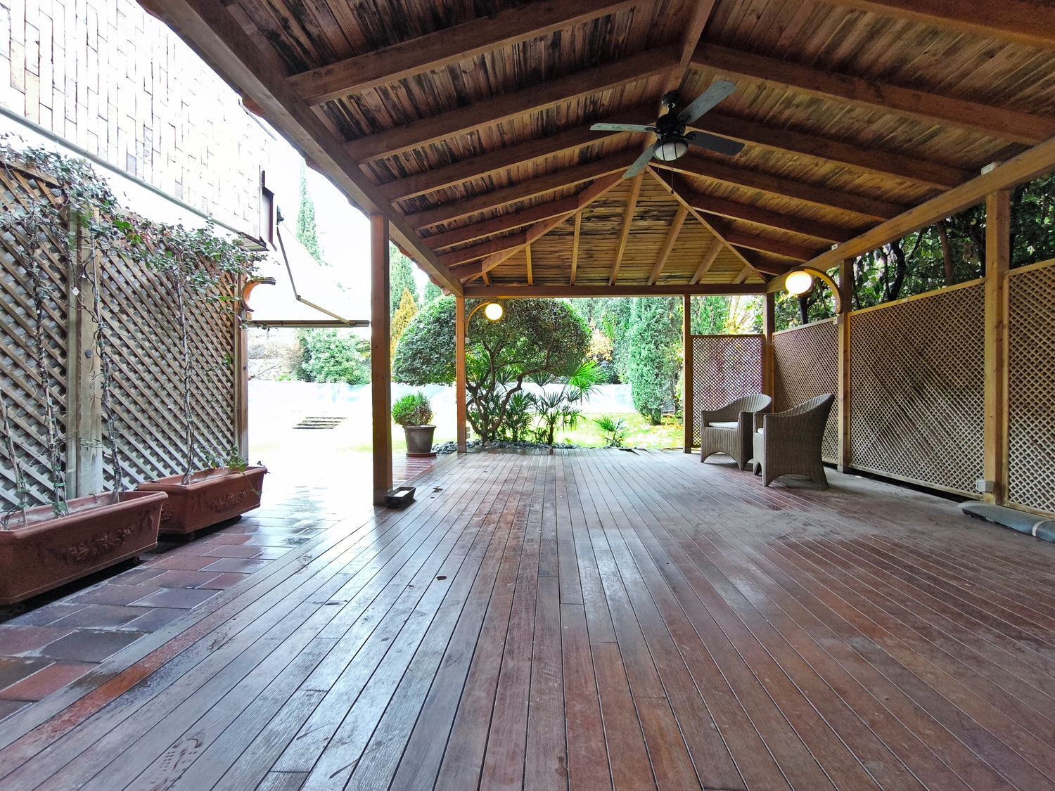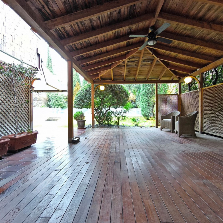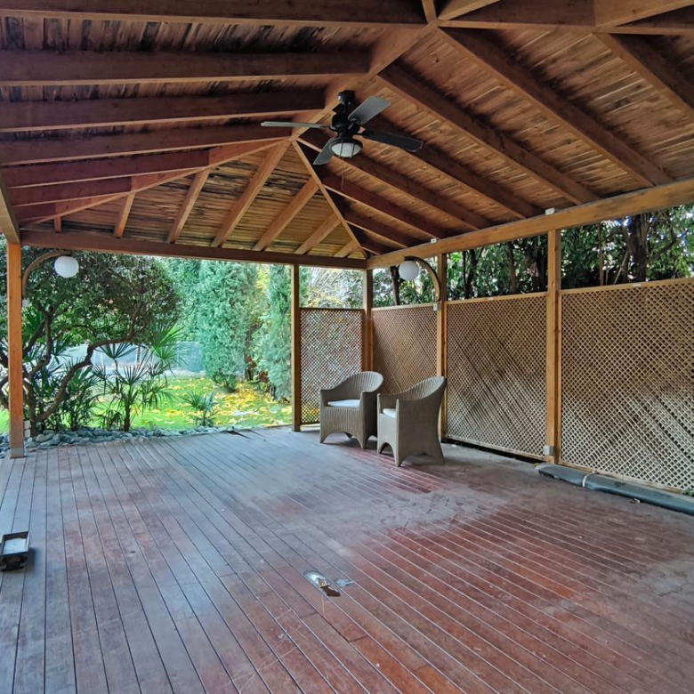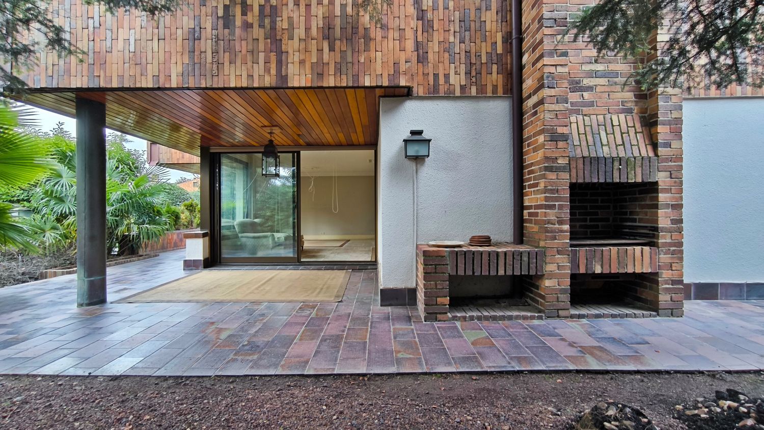 El exterior de la casa es igualmente impresionante. El jardín, perfectamente cuidado, incluye una piscina y varias áreas de descanso, ofrece un espacio de meditación y tranquilidad.