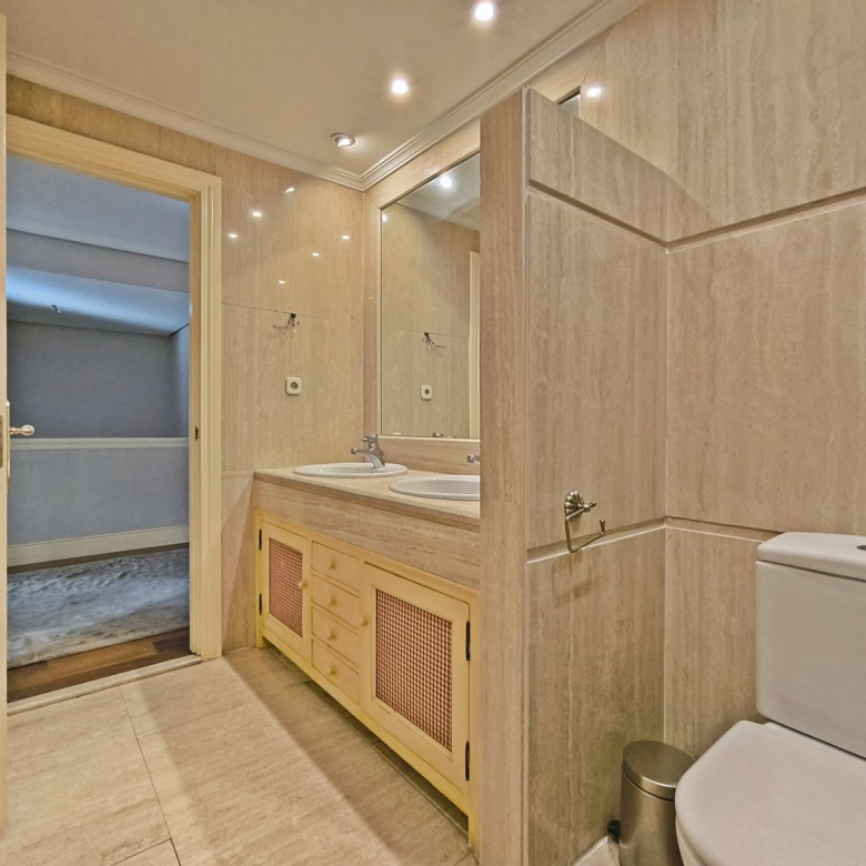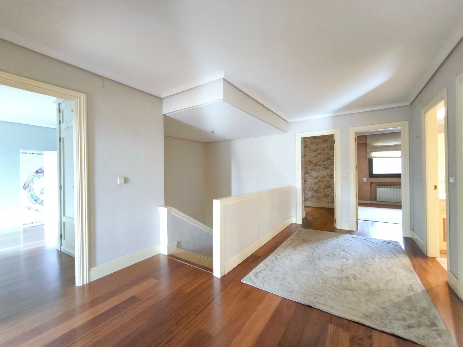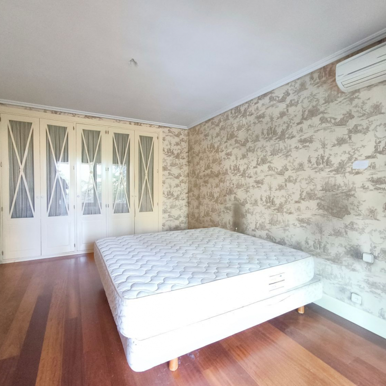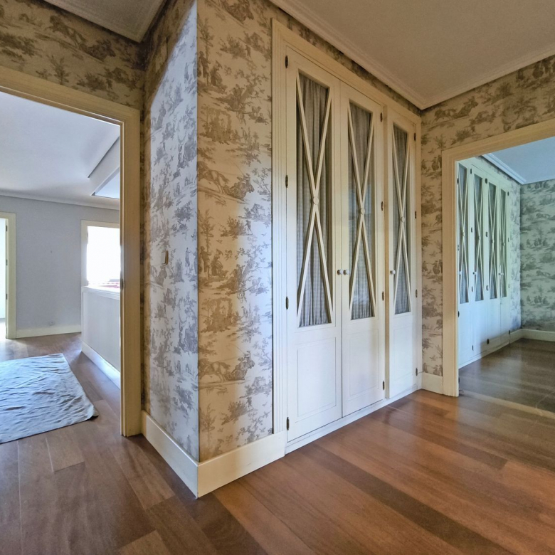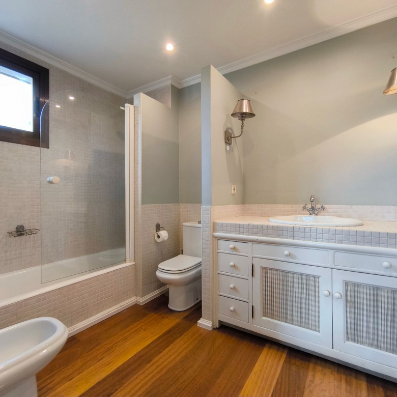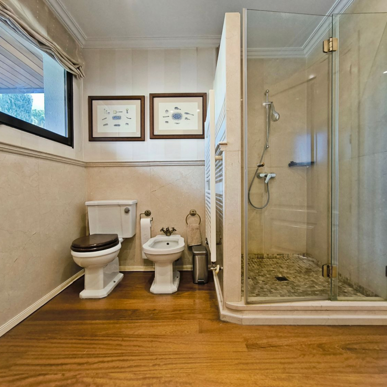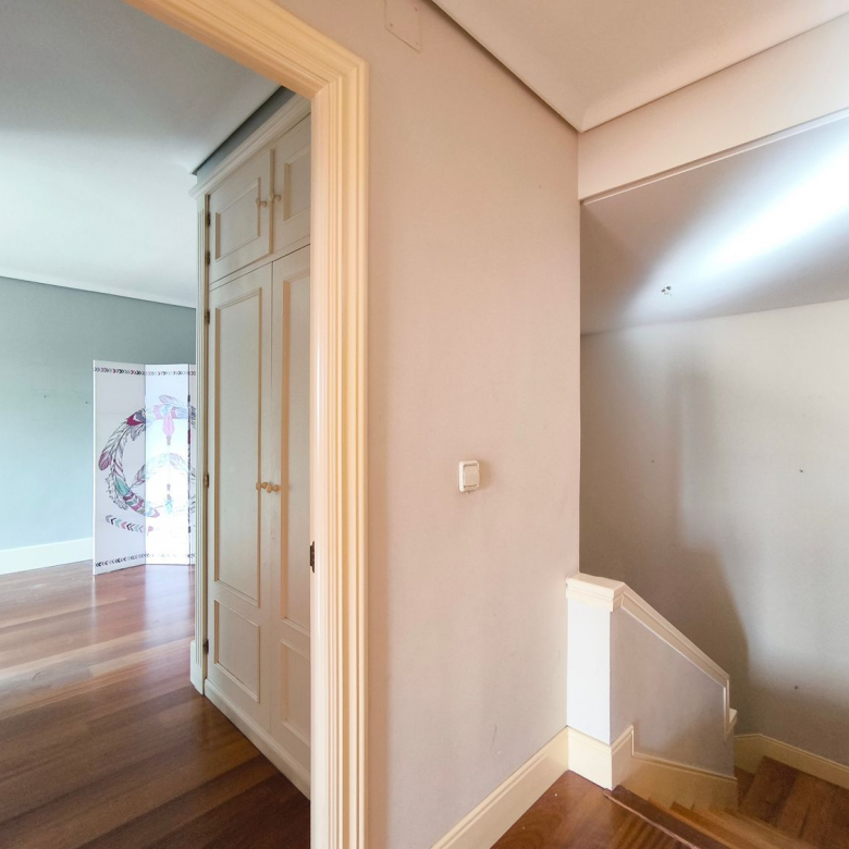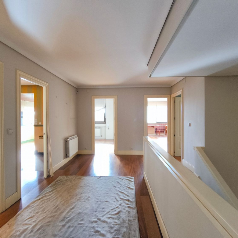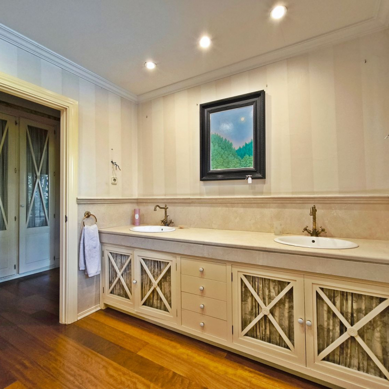 En la planta superior donde se encuentran las habitaciones, comienza con un gran distribuidor que reparte todas las estancias con espacio. La suite principal incluye un amplio vestidor y un baño de lujo con acabados en mármol. A continuación tenemos otra habitación en suite con baño. Las habitaciones secundarias son igualmente espaciosas y están diseñadas con el mismo nivel de detalle y calidad, compartiendo un baño con bañera de hidromasaje.