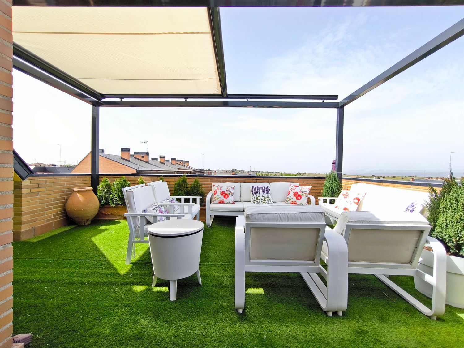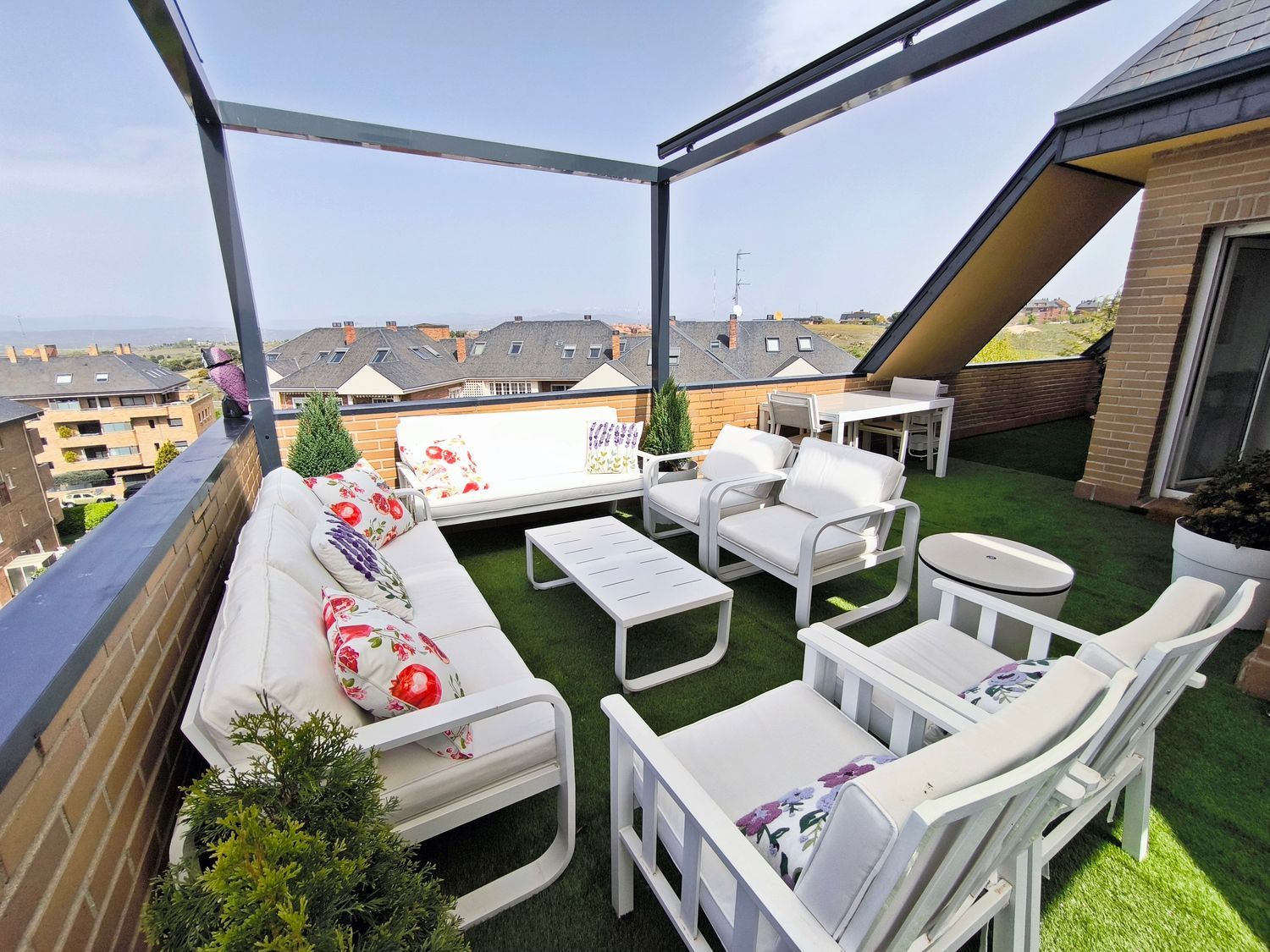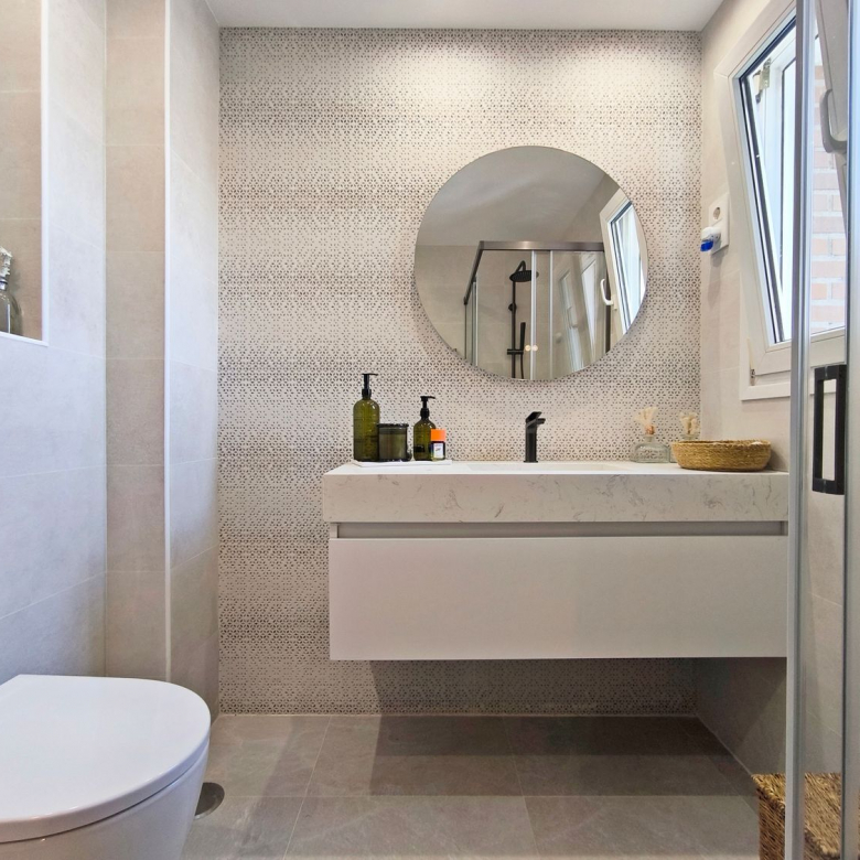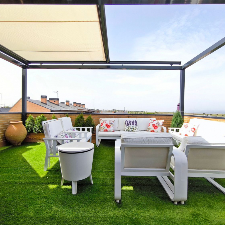 La planta superior dispone de dos dormitorios adicionales, ambos con excelente iluminación natural y buena capacidad de almacenamiento, además de un baño completo también con acabados detallistas. Desde esta planta se accede a una espectacular terraza de gran tamaño, un espacio versátil perfecto para crear una zona chill out, comedor exterior o solárium privado, ideal para disfrutar durante todo el año, la guinda del pastel.